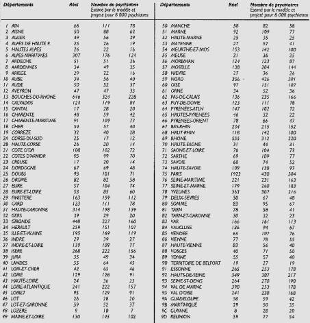 parmi les salari�s. L� aussi de forts �carts entre d�partements existent, selon une �chelle qui varie de 1 � 4 hors Paris[8] . Paris apparaissant � cet �gard comme un des extr�mes puisque la densit� y est de 80 psychiatres pour 100 000 habitants, soit 4 fois plus que la moyenne nationale�!. Malgr� cela, plus de 10% des postes du secteur public ne sont pas pourvus en France.